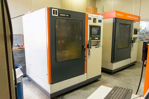 Após a máquina receber o desenho, a máquina de usinagem eletroerosão realiza o processo de corte utilizando um fio, que passa o material bruto pelos cinco eixos da máquina possibilitando o seu corte e desbaste, tornando o processo mais dinâmico e eficiente.